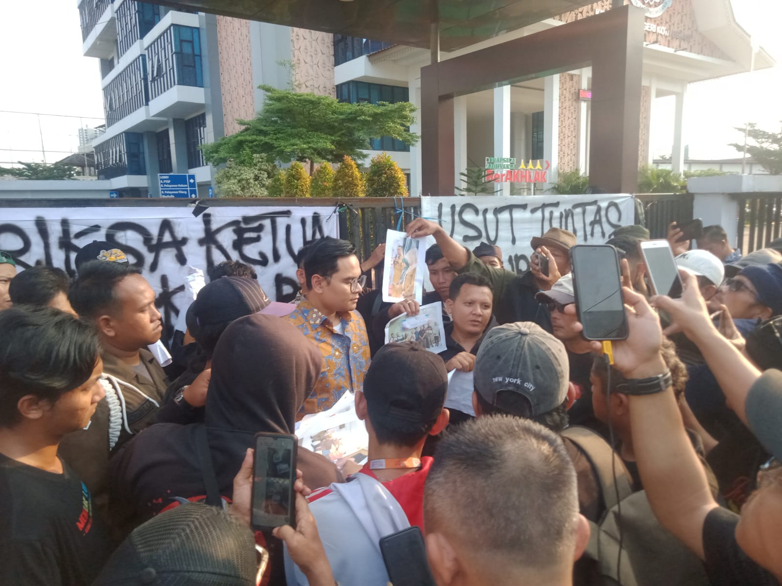 Puluhan demonstran yang tergabung dalam berbagai elemen masyarakat sipil, terdiri dari aktivis mahasiswa dan Lembaga Swadaya Masyarakat (LSM), menggelar aksi unjuk rasa di halaman Kantor Kejaksaan Negeri (Kejari) Kota Bekasi, menuntut penuntasan kasus dugaan penyimpangan anggaran dalam proyek pengadaan alat olahraga di Dinas Pemuda dan Olahraga (Dispora) Kota Bekasi untuk tahun anggaran 2023.