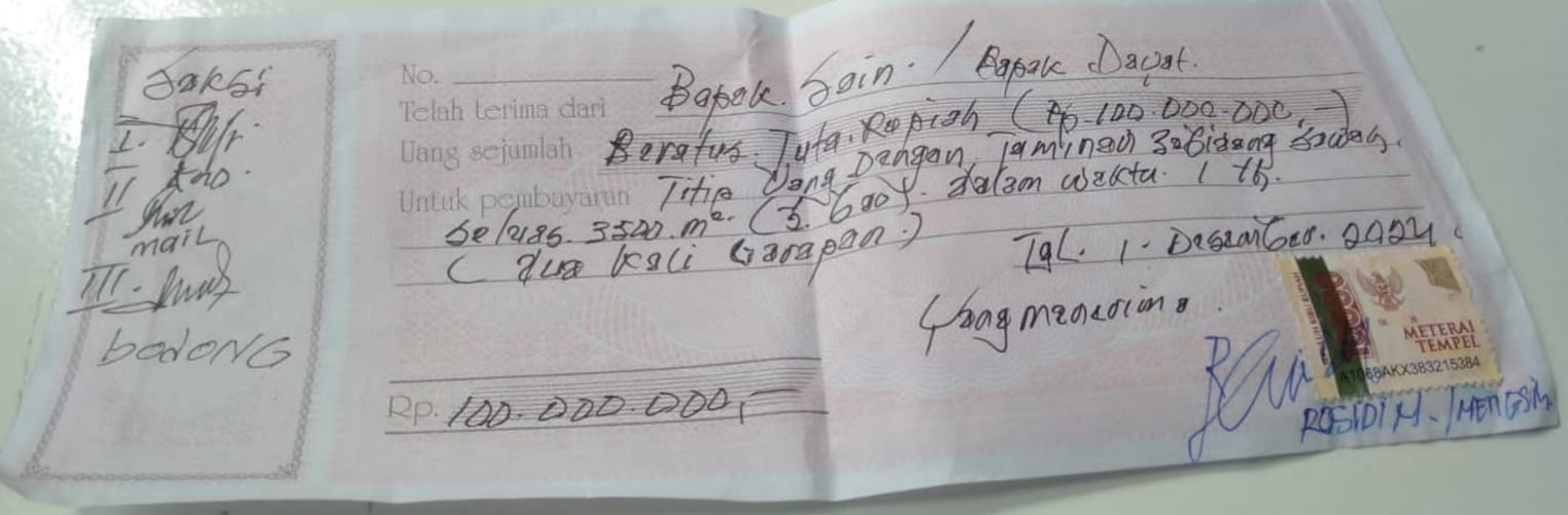 Kwitansi bermeterai yang digunakan pelaku tidak dibuat di hadapan korban, dan memuat identitas palsu, sehingga tergolong dokumen palsu yang merugikan pihak lain.