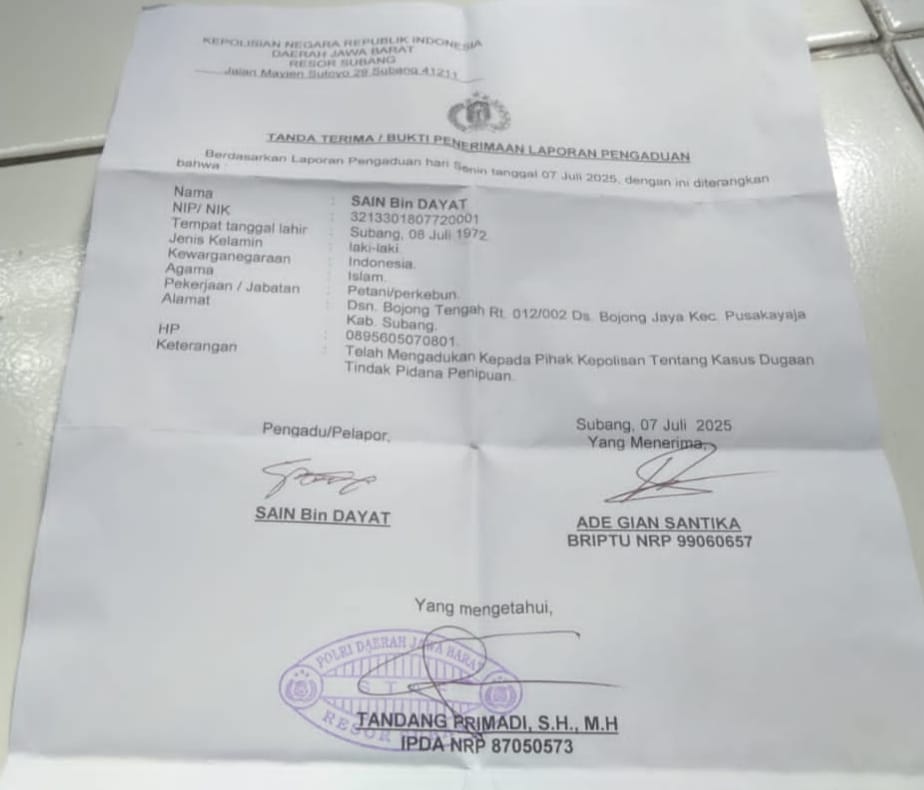 Sain bin Dayat Selalu korban kepada wartawan mengatakan bahwa telah melaporkan kasus ini secara resmi ke Polres Subang pada tanggal 7 Juli 2025, dengan laporan diterima oleh Briptu Ade Gian Santika dan diketahui oleh IPDA Tandang Primadi, S.H., M.H..