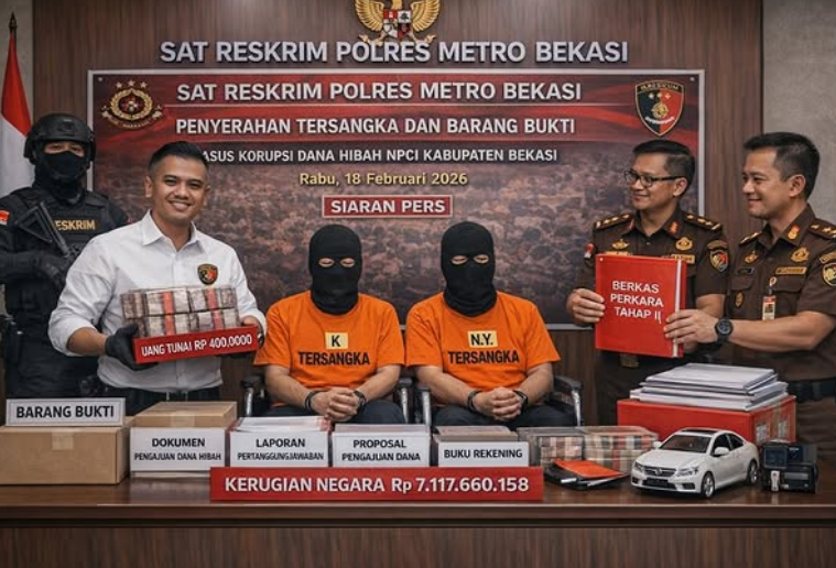 Satuan Reserse Kriminal (Satreskrim) Polres Metro Bekasi menyerahkan dua tersangka dalam perkara dugaan tindak pidana korupsi dana hibah kegiatan National Paralympic Committee Indonesia (NPCI) Kabupaten Bekasi Tahun Anggaran 2024 kepada Kejaksaan Negeri Kabupaten Bekasi, Rabu (18/2/2026). Penyerahan tahap II tersebut dilakukan setelah berkas perkara dinyatakan lengkap atau P-21 oleh jaksa penuntut umum.