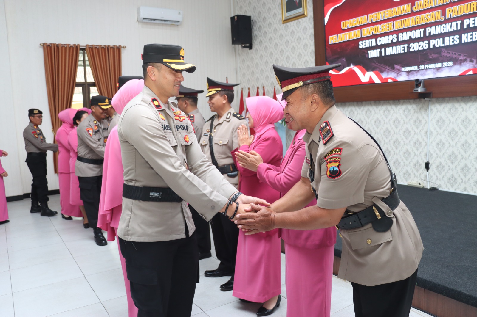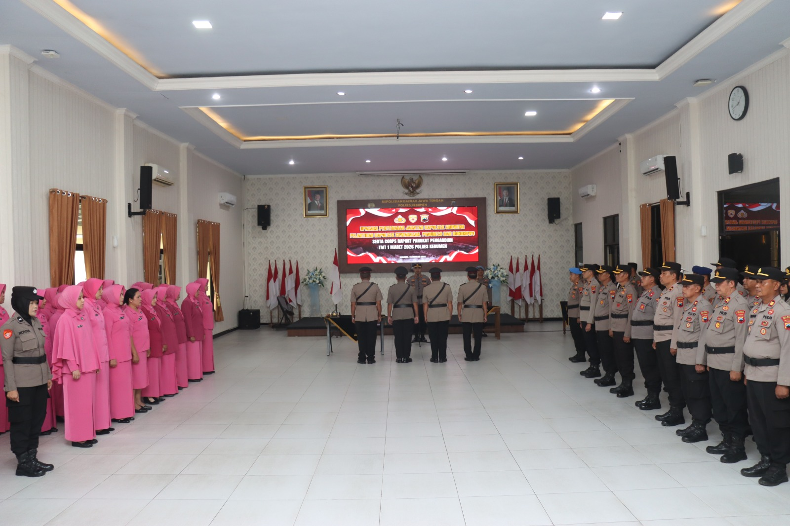 Polres Kebumen menggelar upacara penyerahan jabatan Kapolsek Sruweng dan pelantikan Kapolsek Kuwarasan, Padureso, serta Bonorowo, sekaligus Corp Raport Pangkat Pengabdian TMT 1 Maret 2026. Kegiatan berlangsung di Gedung Tribrata Polres Kebumen, Sabtu, 28 Februari 2026.