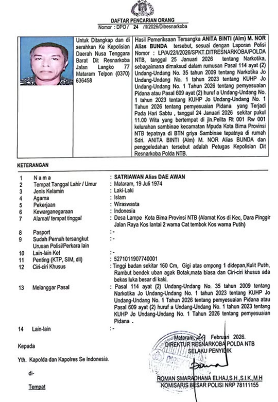 Penerbitan DPO tersebut tertuang dalam surat bernomor: DPO/24/II/2026/Ditresnarkoba, yang dikeluarkan pada Februari 2026. Dalam dokumen tersebut disebutkan bahwa tersangka diduga terlibat dalam perkara narkotika berdasarkan laporan polisi Nomor: LP/A/221/2026/SPKT.DITRESNARKOBA/POLDA NTB tanggal Januari 2026.