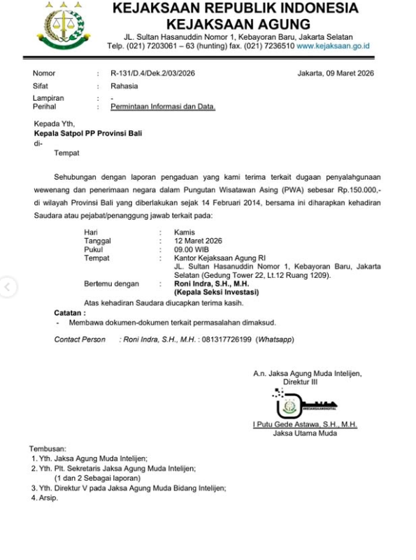 Hingga saat ini, belum ada keterangan resmi terkait perkara spesifik yang menjadi fokus perhatian Kejaksaan Agung di Bali. Namun, perkembangan tersebut diperkirakan menjadi bagian dari upaya penguatan pengawasan dan optimalisasi penegakan hukum di wilayah tersebut.