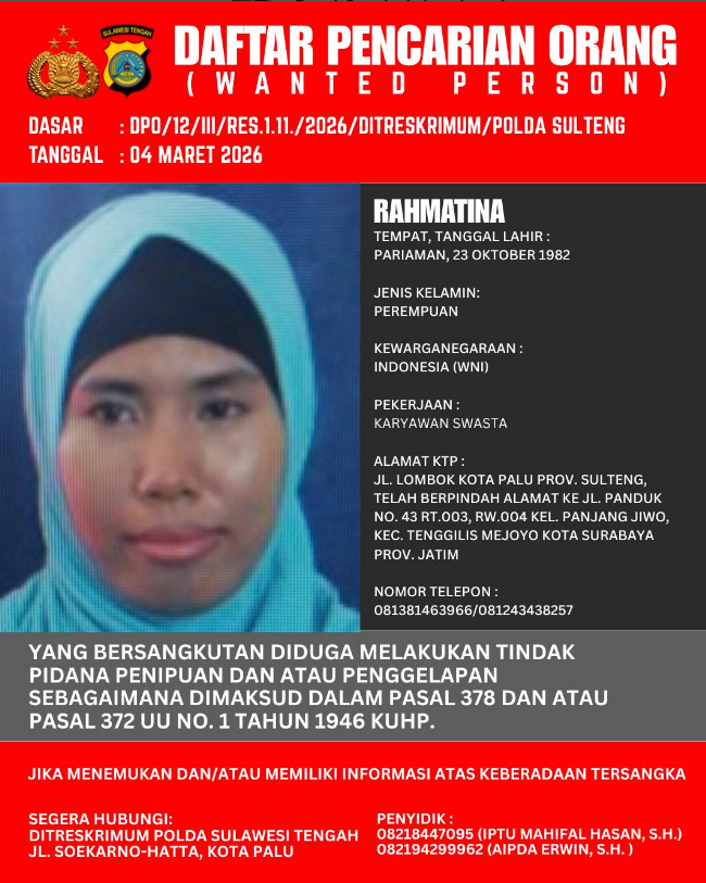Direktorat Reserse Kriminal Umum (Ditreskrimum) Polda Sulawesi Tengah resmi menerbitkan Daftar Pencarian Orang (DPO) terhadap seorang perempuan bernama Rahmatina yang diduga terlibat dalam tindak pidana penipuan dan/atau penggelapan.
