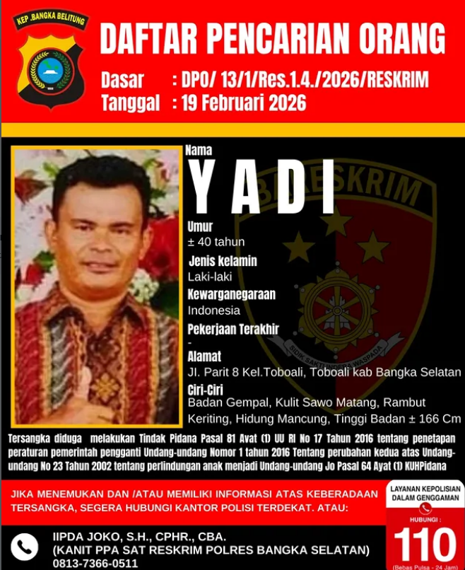 Kepolisian Resor (Polres) Bangka Selatan resmi menerbitkan Daftar Pencarian Orang (DPO) terhadap seorang pria berinisial Yadi yang diduga terlibat dalam tindak pidana terkait perlindungan anak. Penerbitan DPO tersebut tertuang dalam surat nomor: DPO/13/1/Res.1.4./2026/Reskrim, tertanggal 19 Februari 2026.