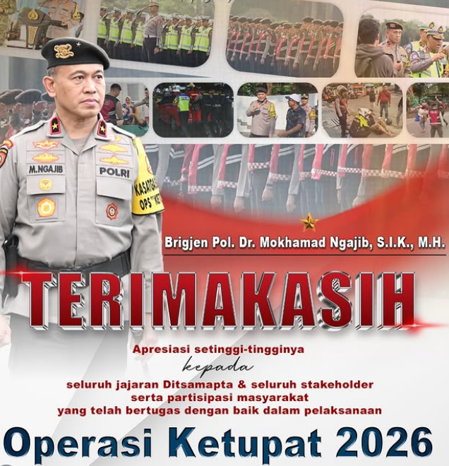 Direktur Samapta Korsabhara Baharkam Polri, Brigjen Pol. Mokhamad Ngajib, SIK, MH, menyampaikan apresiasi dan ucapan terima kasih kepada seluruh jajaran serta pihak terkait atas keberhasilan pelaksanaan Operasi Ketupat 2026.