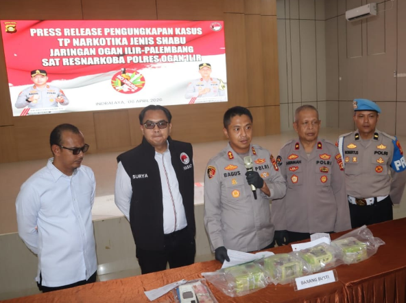 Satuan Reserse Narkoba Polres Ogan Ilir berhasil mengungkap jaringan peredaran narkotika jenis sabu dengan mengamankan dua orang tersangka serta menyita barang bukti seberat bruto 4.239 gram. Pengungkapan kasus ini disampaikan secara resmi dalam kegiatan press release yang digelar pada Senin (6/4/2026) di Aula Panaluan II Polres Ogan Ilir.
