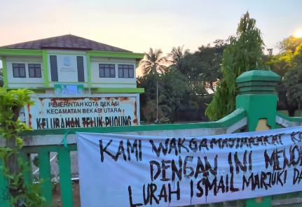 Kebijakan Lurah Teluk Pucung, Ismail Marjuki, yang melarang penggunaan halaman kantor kelurahan untuk kegiatan pesta pernikahan menuai polemik di tengah masyarakat. Penolakan warga terlihat dari banyaknya spanduk protes yang dipasang di depan Kantor Kelurahan Teluk Pucung, Kecamatan Bekasi Utara, pada Selasa (7/4/2026).