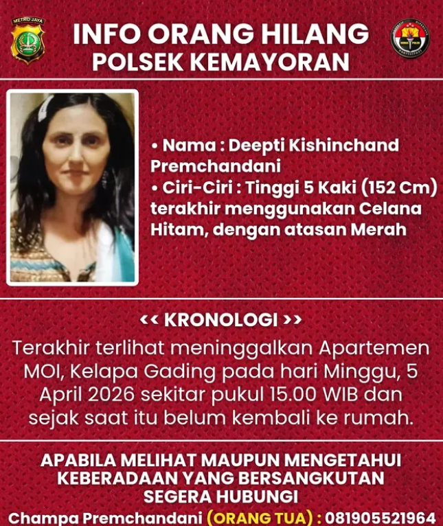 Polsek Kemayoran menginformasikan laporan orang hilang atas seorang perempuan bernama Deepti Kishinchand Premchandani yang hingga saat ini belum kembali ke kediamannya.