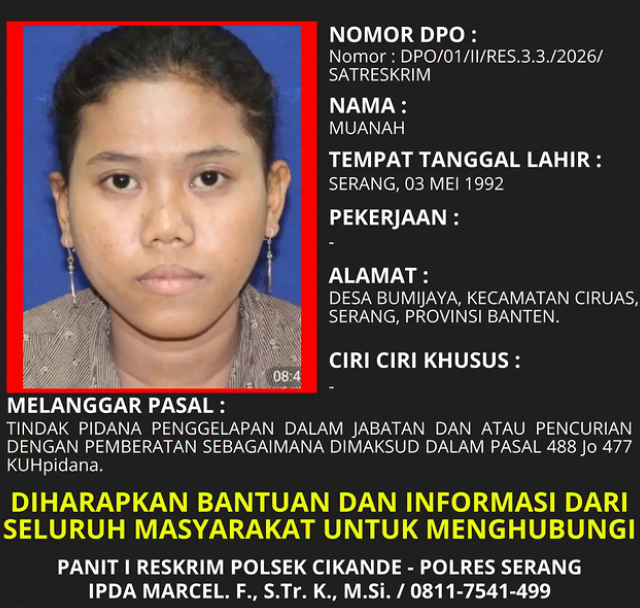 Kepolisian Resor (Polres) Serang menerbitkan Daftar Pencarian Orang (DPO) terhadap seorang perempuan bernama Muanah , yang diduga terlibat dalam kasus tindak pidana penggelapan dalam jabatan dan/atau pencurian dengan pemberatan .
